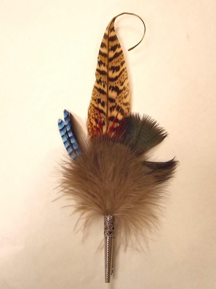 ◄ Broche poil de sanglier marron et plumes Broche peau de cerf et plume de geai et perdrix ►