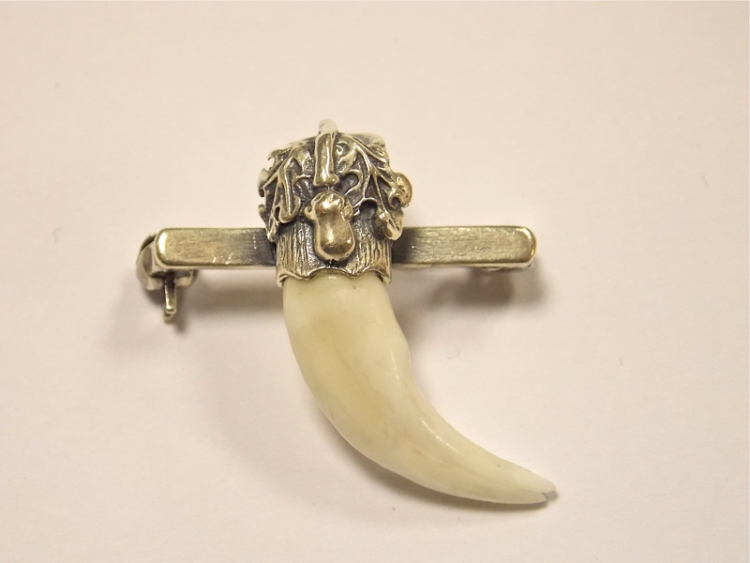 Broche dent de renard sertie par les feuilles de chêne en argent massif