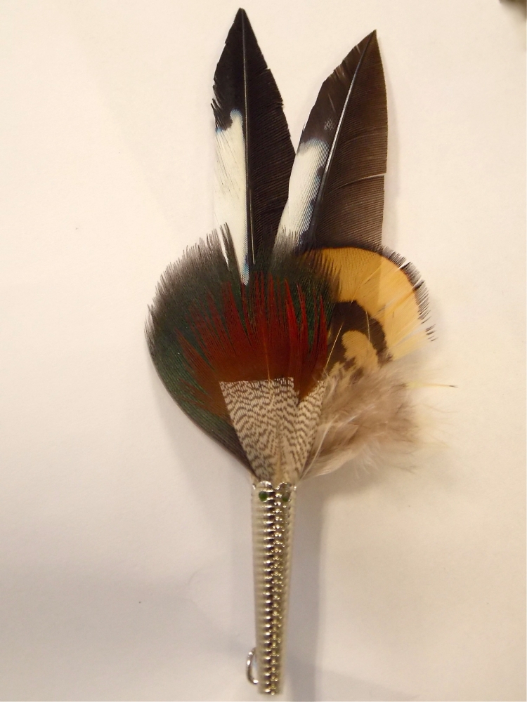 ◄ Broche plume de geai sur feuille de chêne Broche peau de cerf et plume de geai, perdrix tête de cerf ►