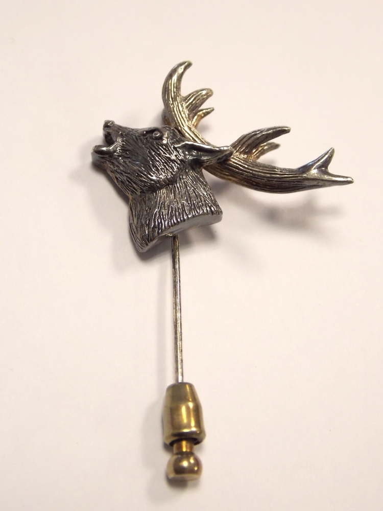 Epingle tête de cerf en argent vieilli et argent avec fermoir de sécurité type stoppeur.