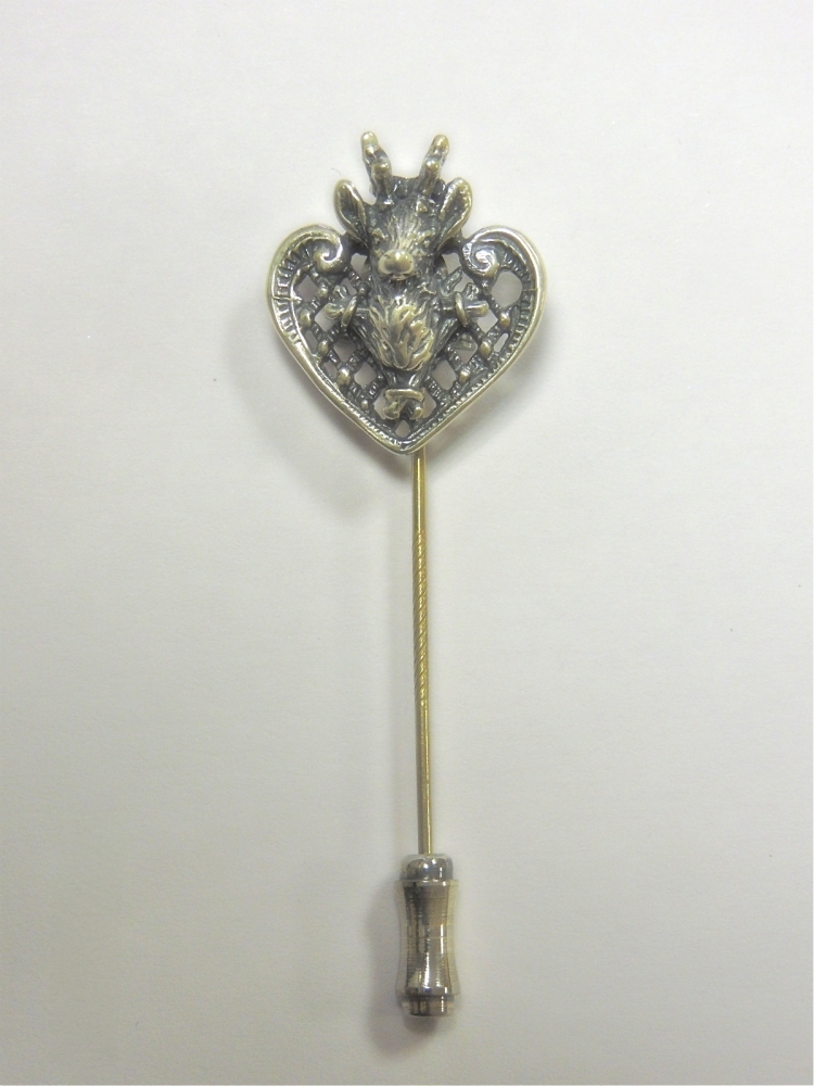 Epingle en argent massif tête de chevreuil sur coeur ouvragé.